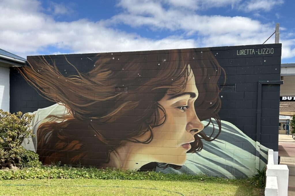 Loretta is a world-renowned artist. Her world can be found all over the world from Melbourne to Vancouver and London. Loretta Lizzio is a Gold Coast based artist. Loretta has a unique style in that she paints/photographs her models like they are swimming and then paints as if the hair and clothes are flowing. She uses the weightlessness as a basis for her murals. Loretta crosses between the art styles of photography and murals. She used aerosols only. She has shown how, with shading, you can make a face come alive. You can see that skill in this piece and some others nearby. Notice the details in the hair and eyelashes, skin tone and lips.