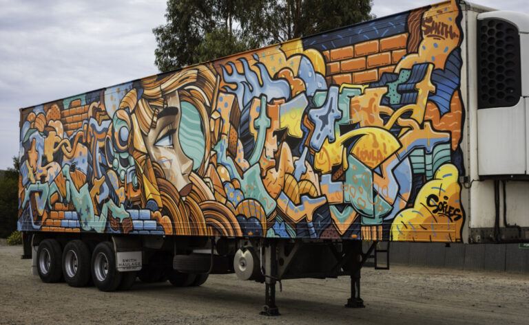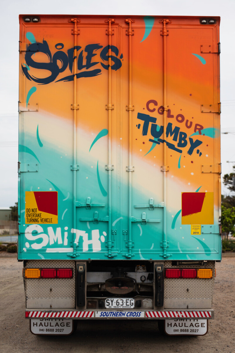 A Queensland based street artist, Sofles is one of the most well known street artists in the world due to his many YouTube videos which attract millions of viewers. He was given the huge task of painting a whole refrigeration unit (both Sides) in 3 days. Sofles’ trailer photo board is in the council car park. It is a mobile masterpiece on a refrigerated trailer belonging to Smith Haulage. This concept showed amazing trust and faith by this local trucking company allowing their brand new refrigerated trailer to be painted on both sides by a street artist. They didn’t know what he was going to paint which shows even more trust and faith. These pieces are not in Tumby Bay very often, but can be viewed all over Australia as it is towed as a part of a Smith’s road train. It could be seen in Darwin, Melbourne, Alice Springs, Roxby Downs, Adelaide or on the roads in between. It is eye catching and makes people wonder about the origins of the mural and then lead to thoughts about Tumby Bay. It was painted entirely with aerosols in 3 and a half days. There is so much detail, which shows the skill and ability of Sofles to swiftly work but add detail. Most of the artists have not had any formal training. Many artists were originally underground graffiti artists who have turned their life around and have made a good career from their skills.